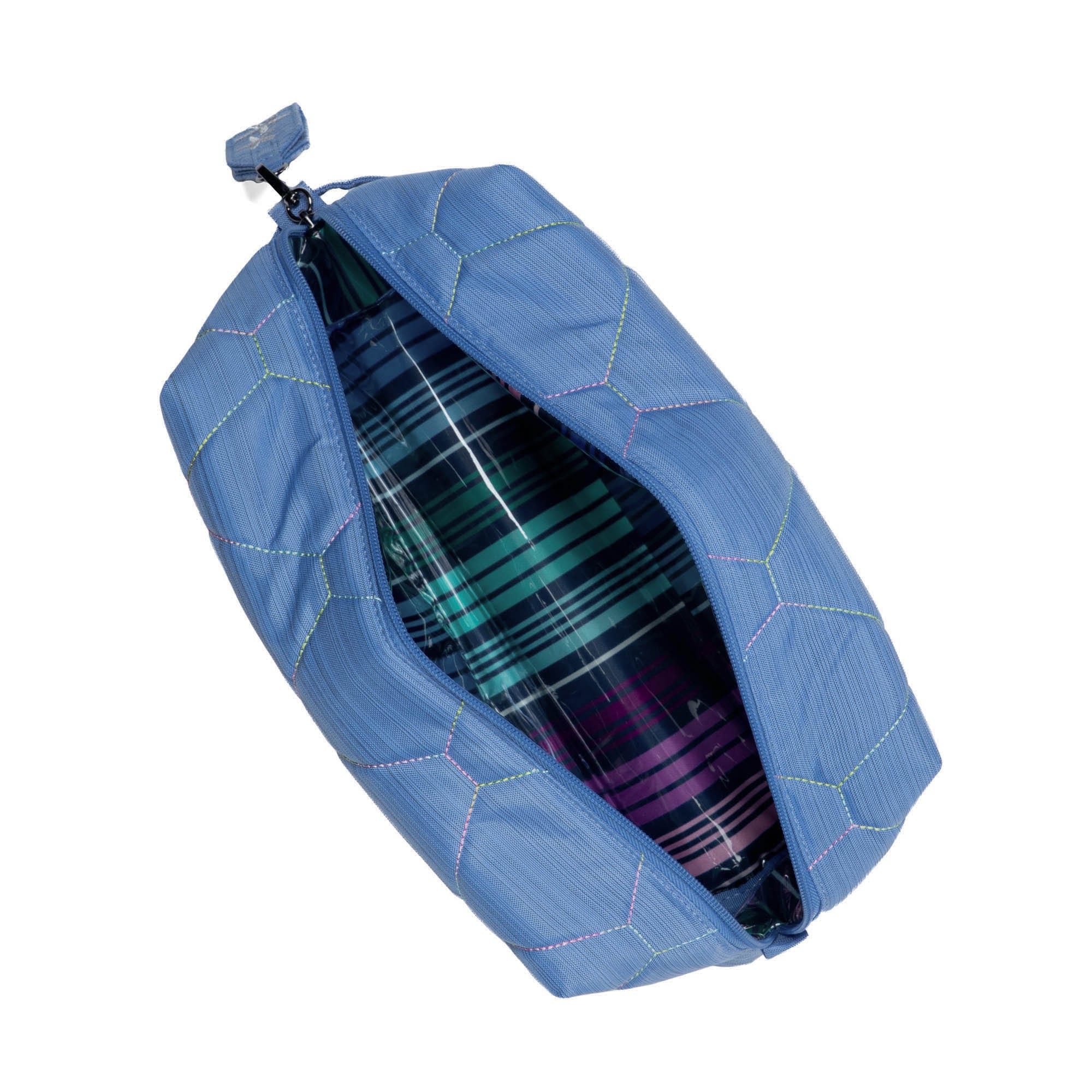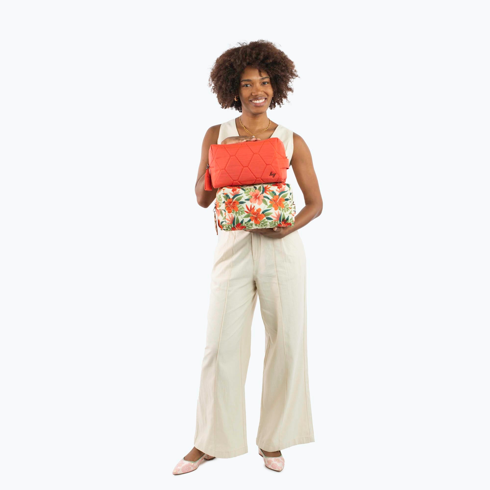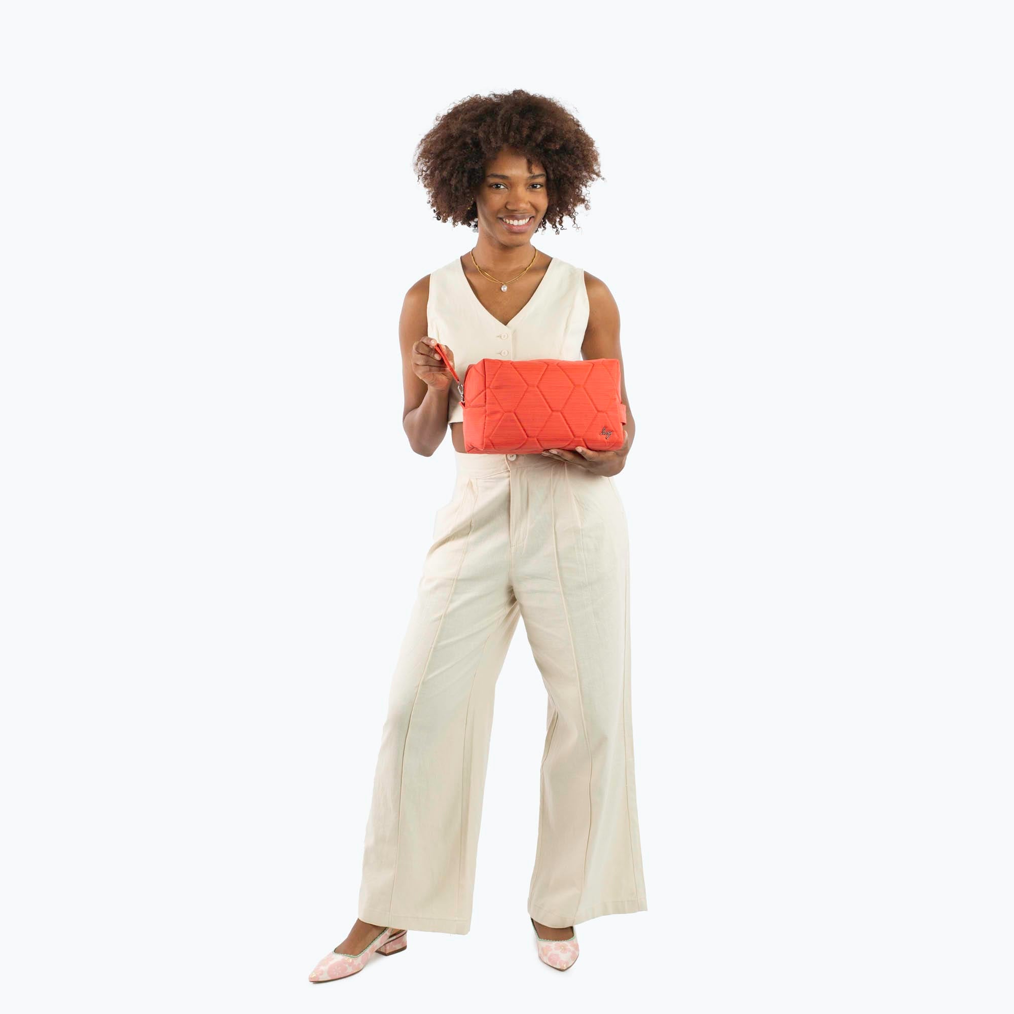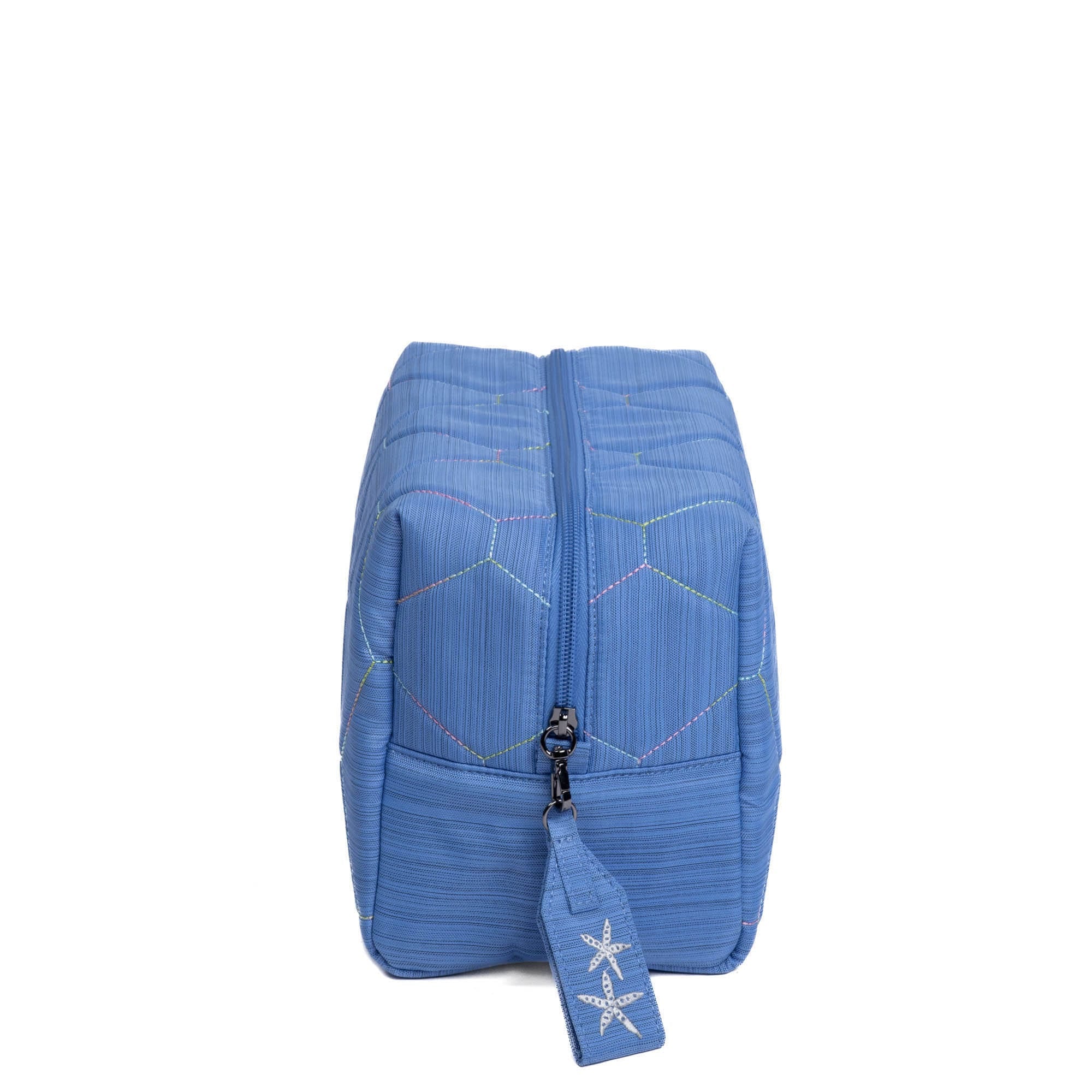 Bumper Cosmetic Case is a boxy cosmetic case that packs a lot of punch. It's got a tote handle, removable zipper pull tag, and did you notice the zipper? Each one is embroidered to match the bag's pattern — butterflies, birds, and beyond.