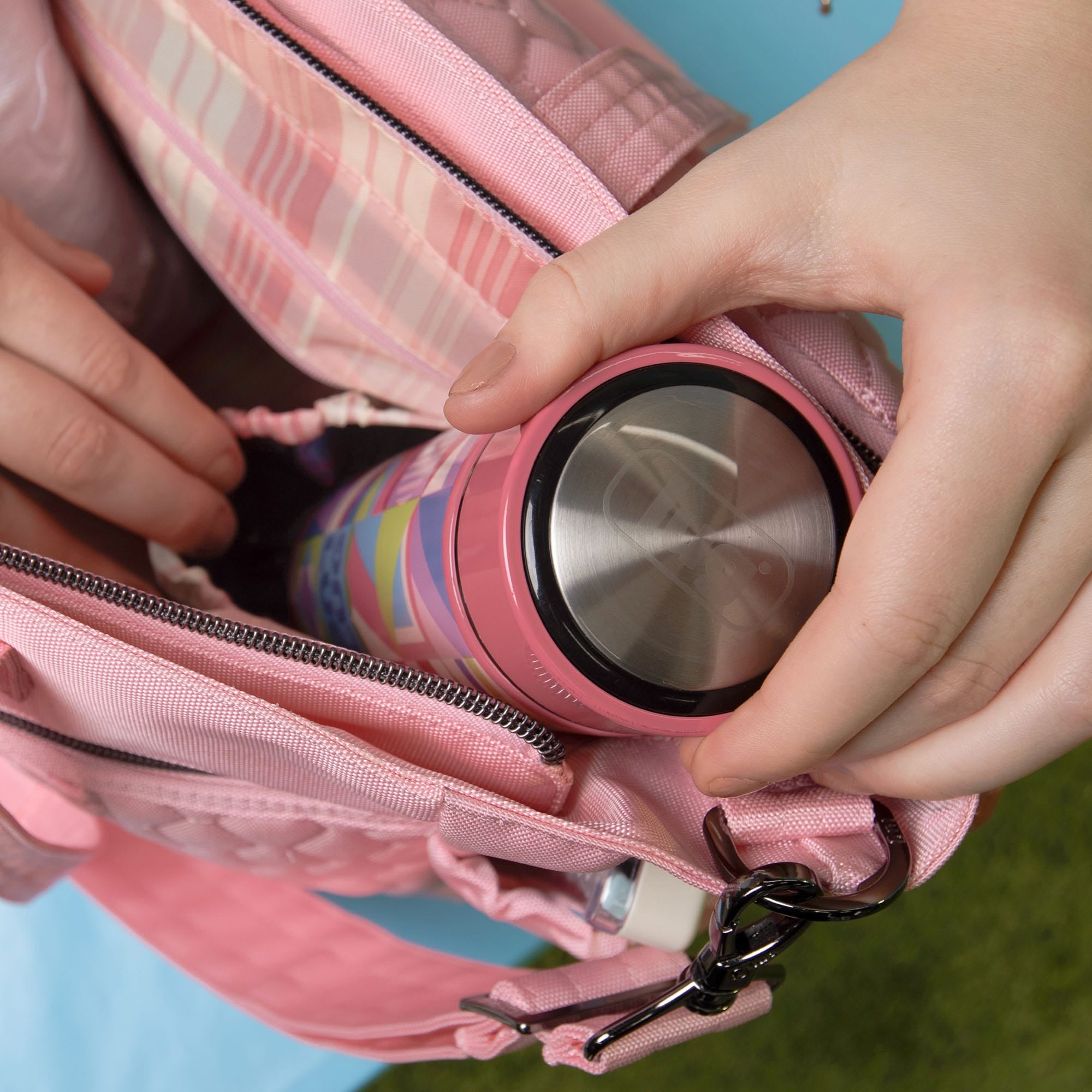 - Front zipper compartment: