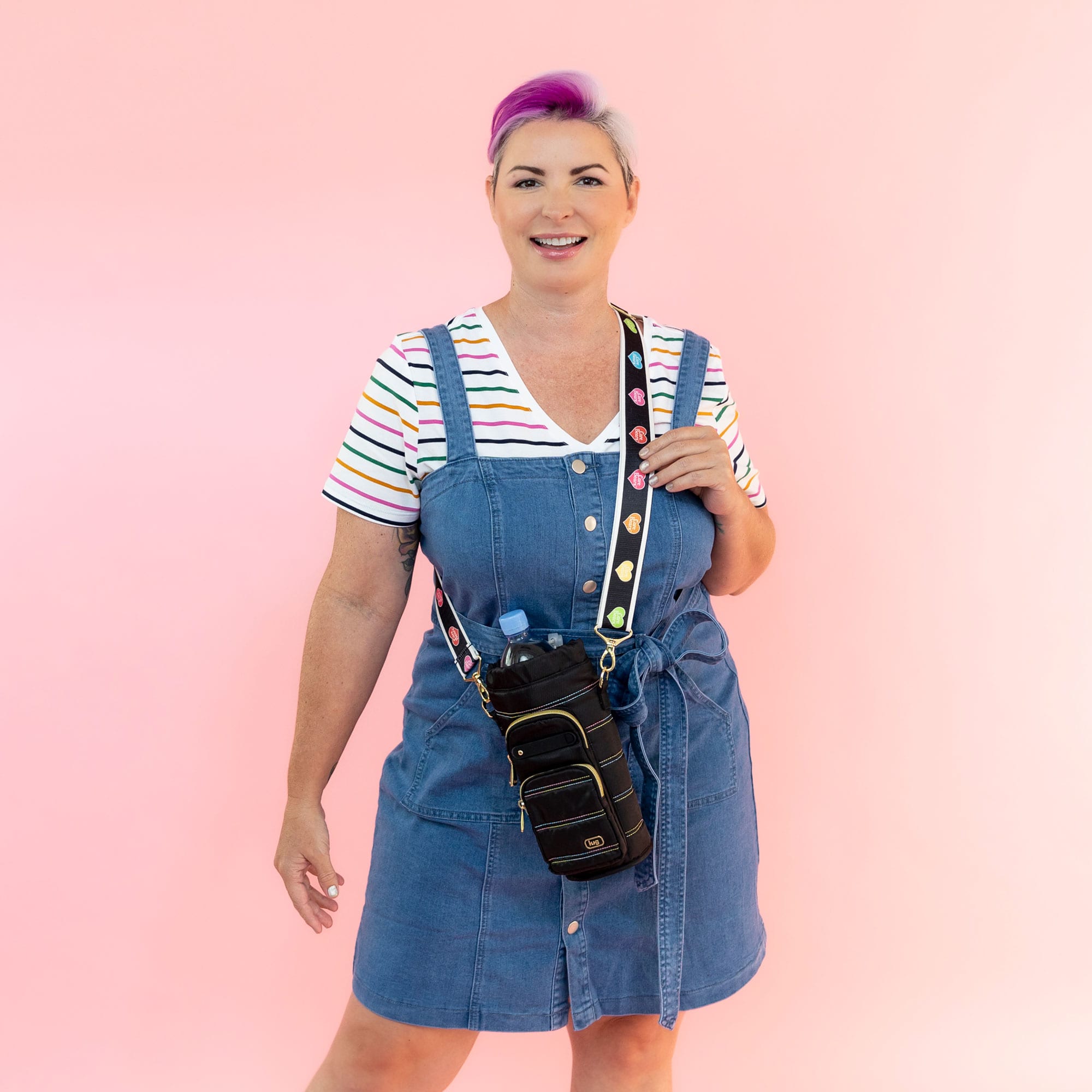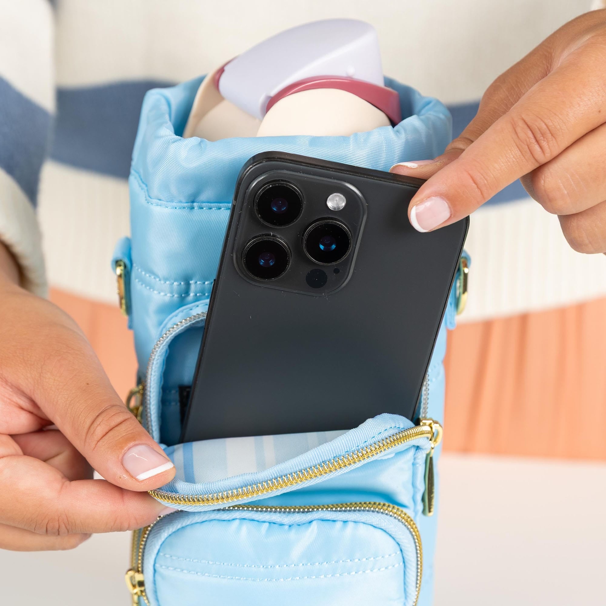 Stay fueled and hands-free with the Huggie Wide — your go-to water bottle holder with stylish extras. Its insulated compartment keeps your drink just right, while gold hardware and a customizable charm bar let your personality shine. With multiple zip pockets, belt loops for waist pack wear, and a removable crossbody strap, this multitasking must-have is perfect for crisp morning walks, school drop-offs, or wherever your routine takes you.