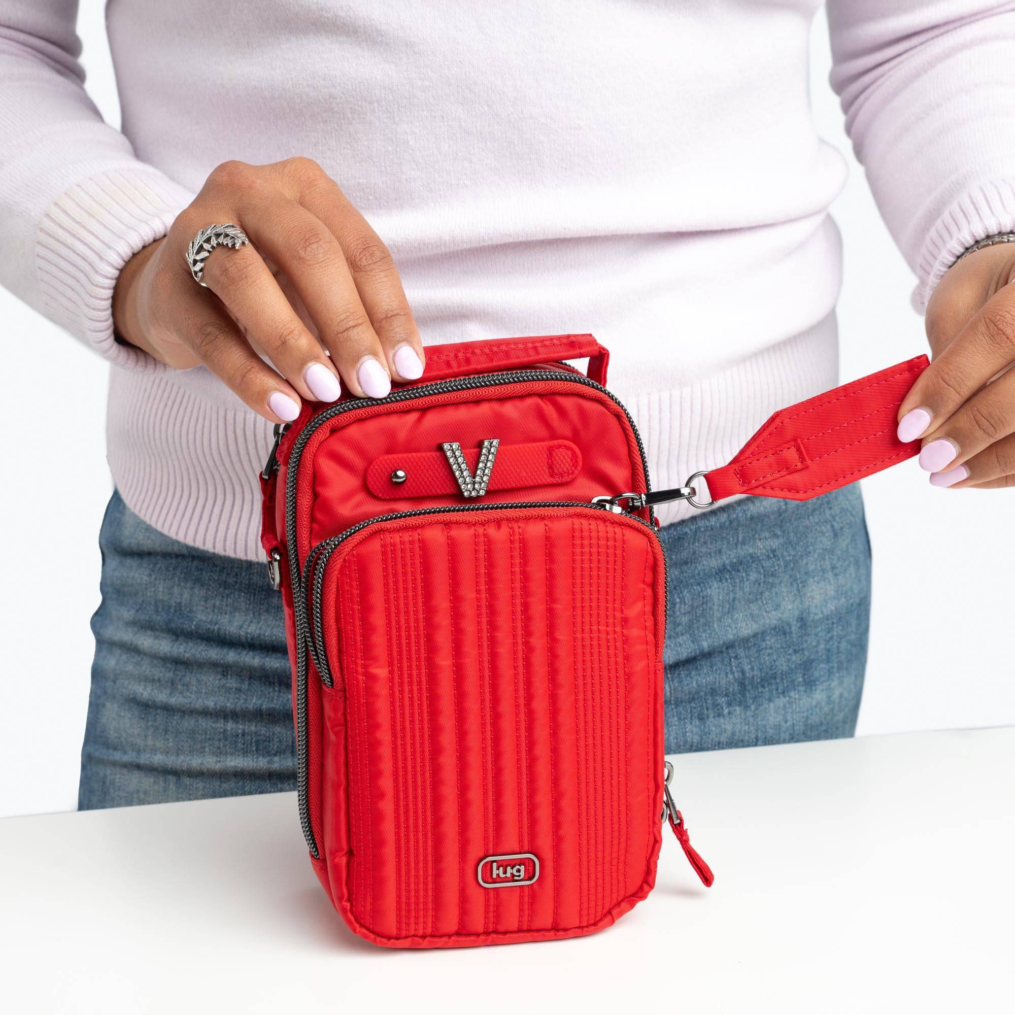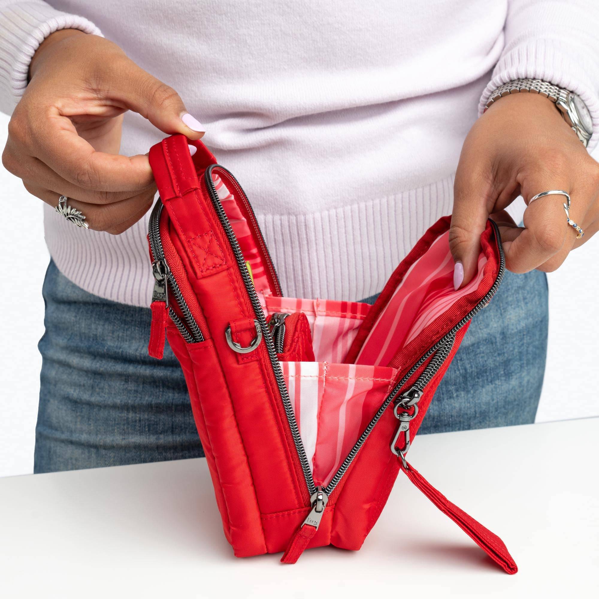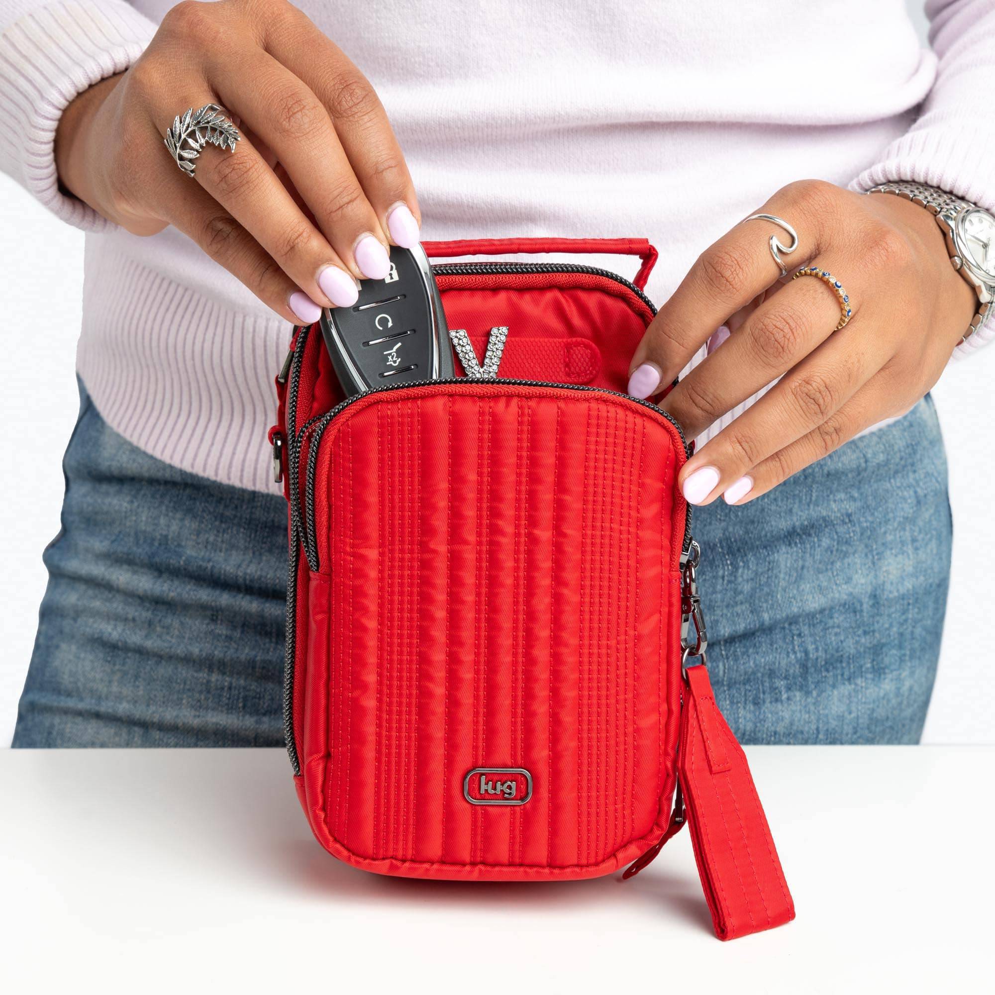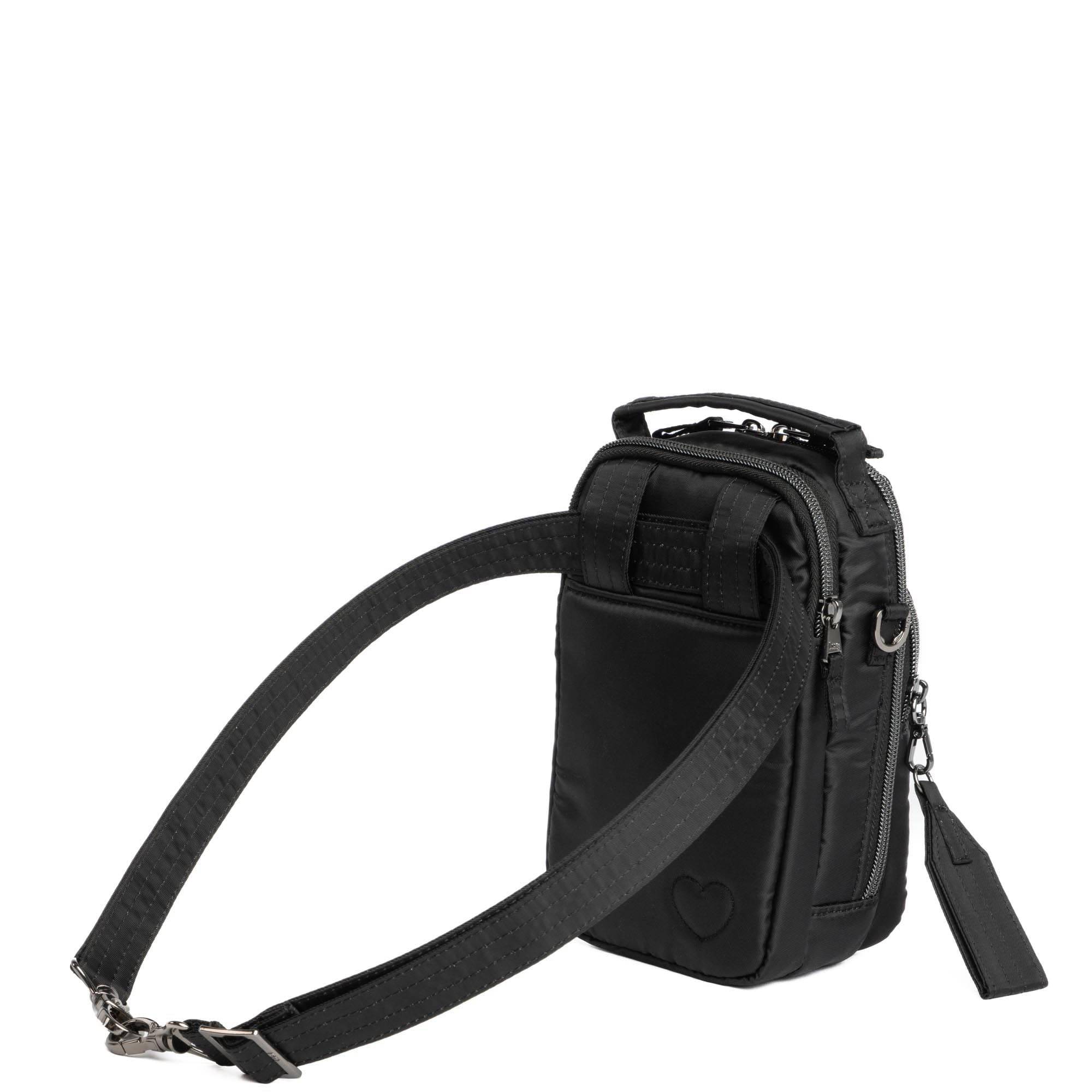 Fall head over heels for this mini marvel that combines smart design and versatility. Stay organized with the accordion-style main compartment, soft-lined rear pocket, and RFID-protected clearview ID slot up front. The charm bar and interchangeable pulley let you express your style, while the belt loops and adjustable strap make it as versatile as it is adorable. Adding even more heart, this bag features subtle morse code stitching spelling "love" on the front and a stitched heart detail, making it a true expression of affection.