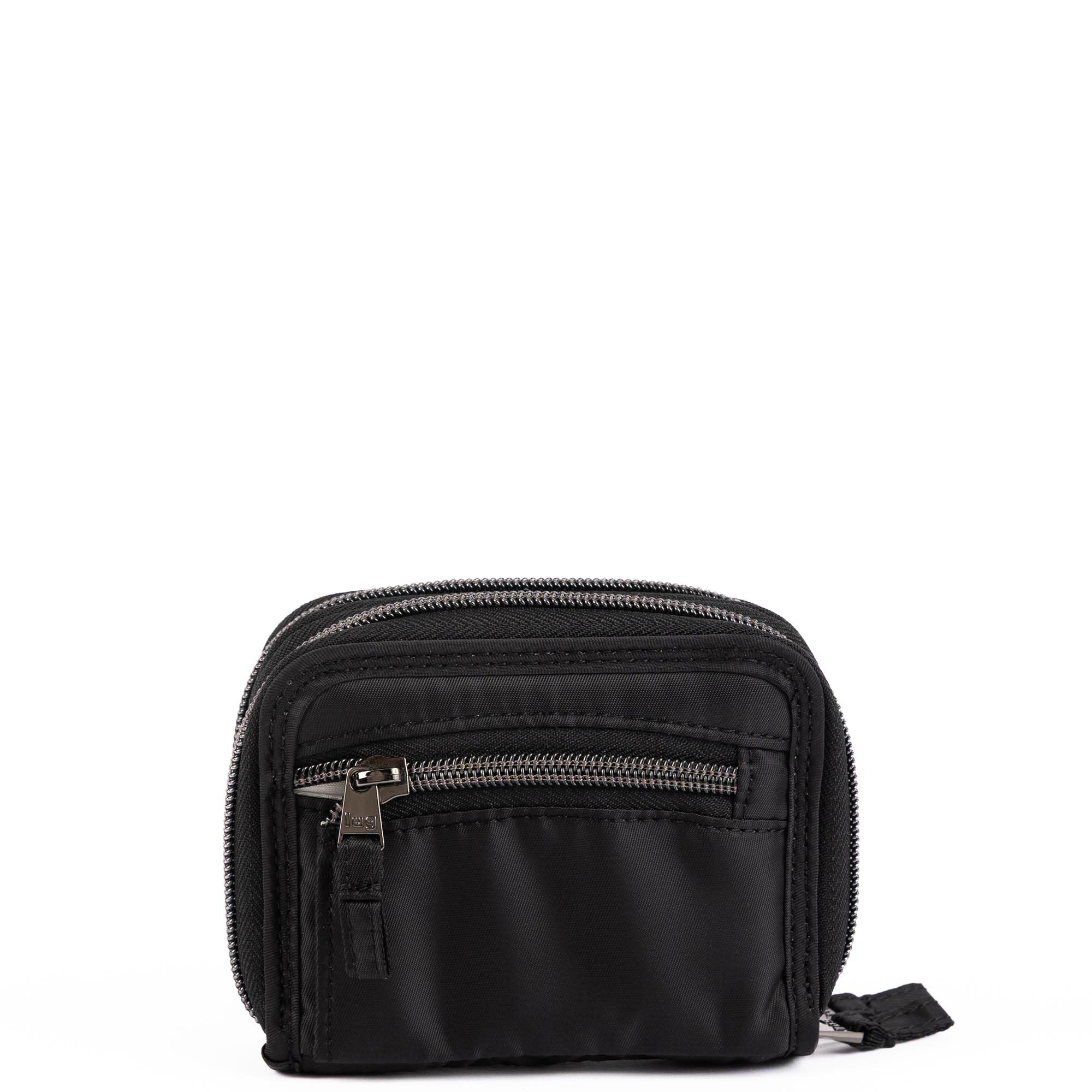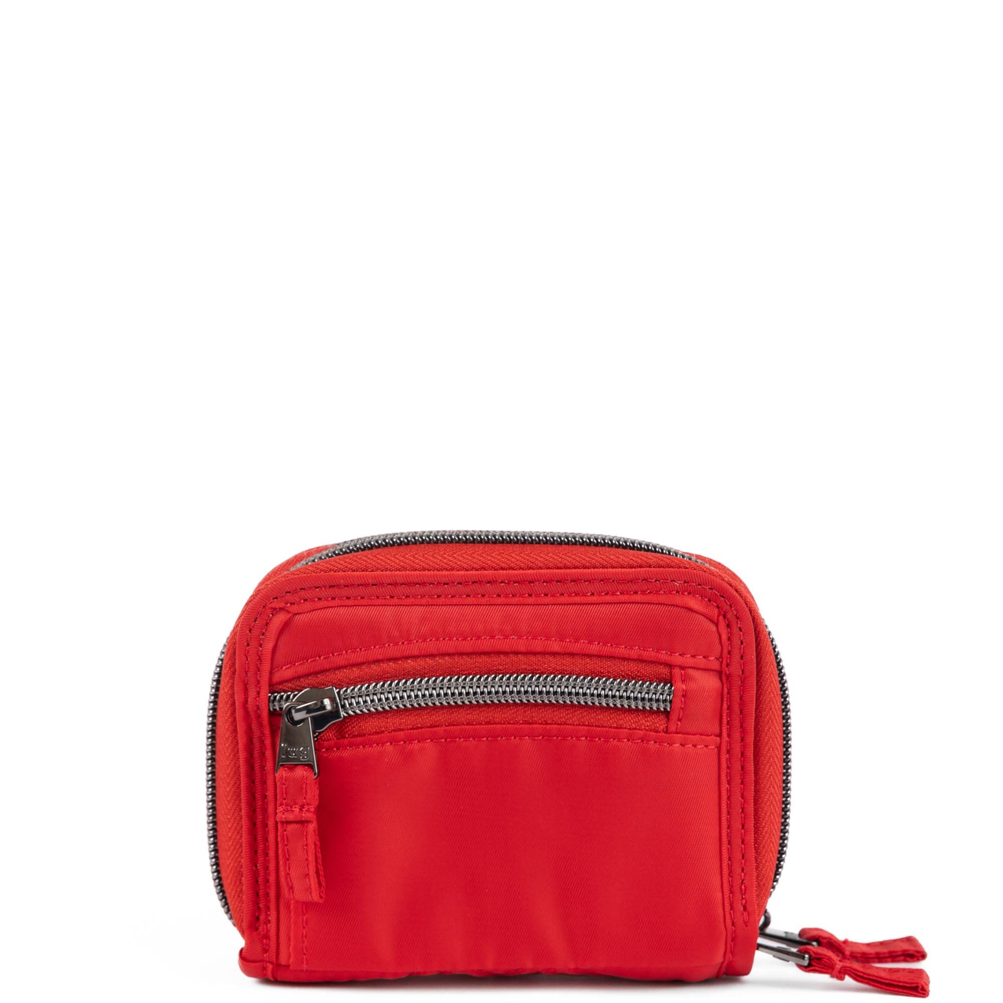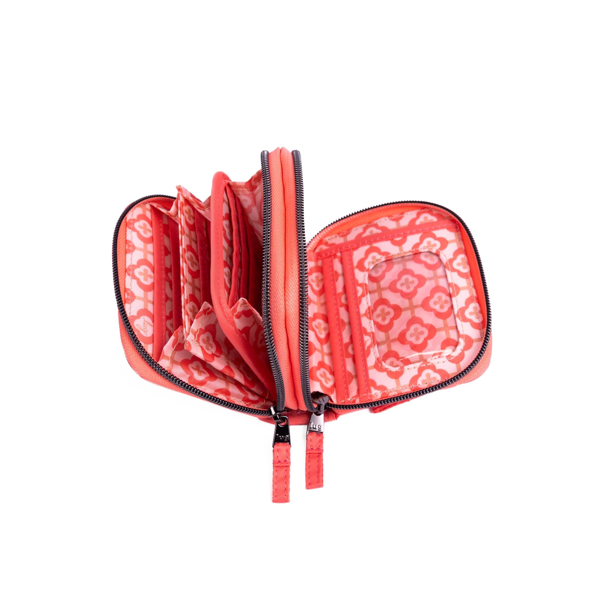 This mighty little wallet has a split personality with not one, but two main compartments. One side opens flat and stores bills, frequently used cards, and has a handy ID window. The other opens like an accordion, making the rest of your cards exceptionally easy to access. And for coins, a zip pouch on the back.