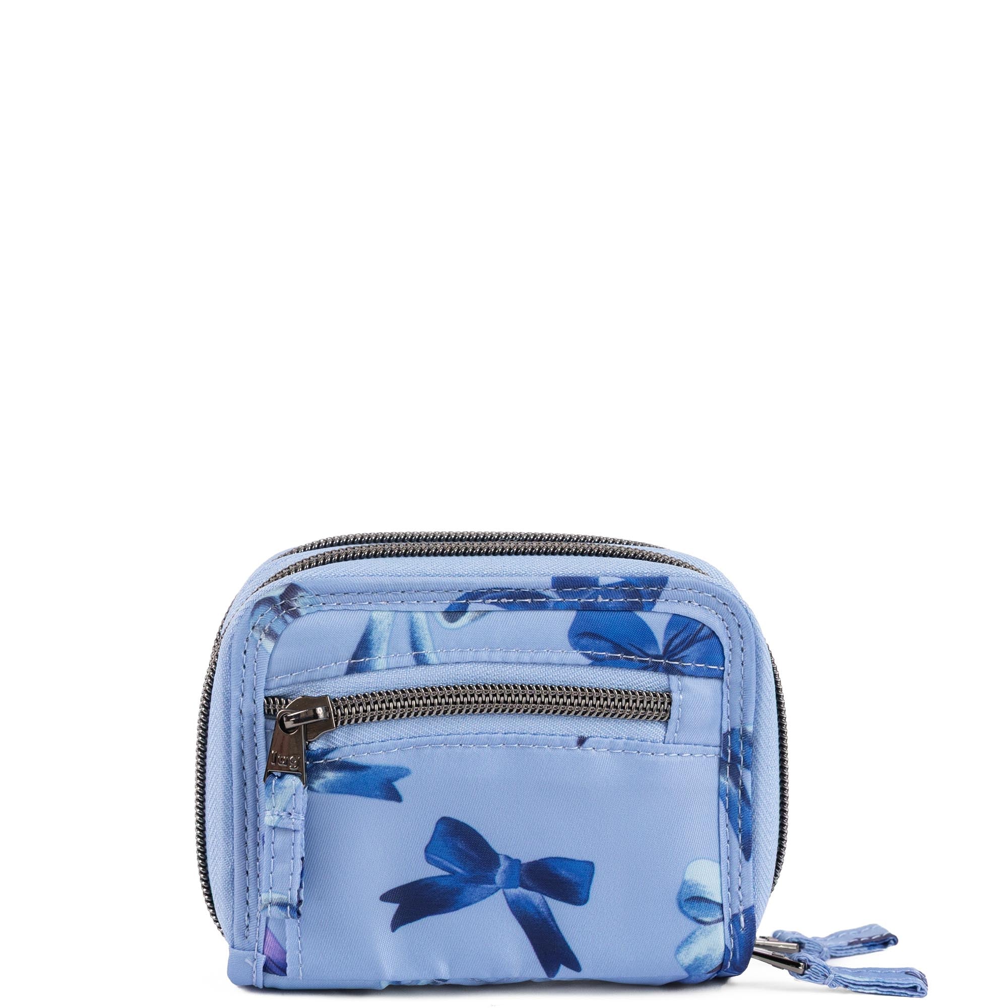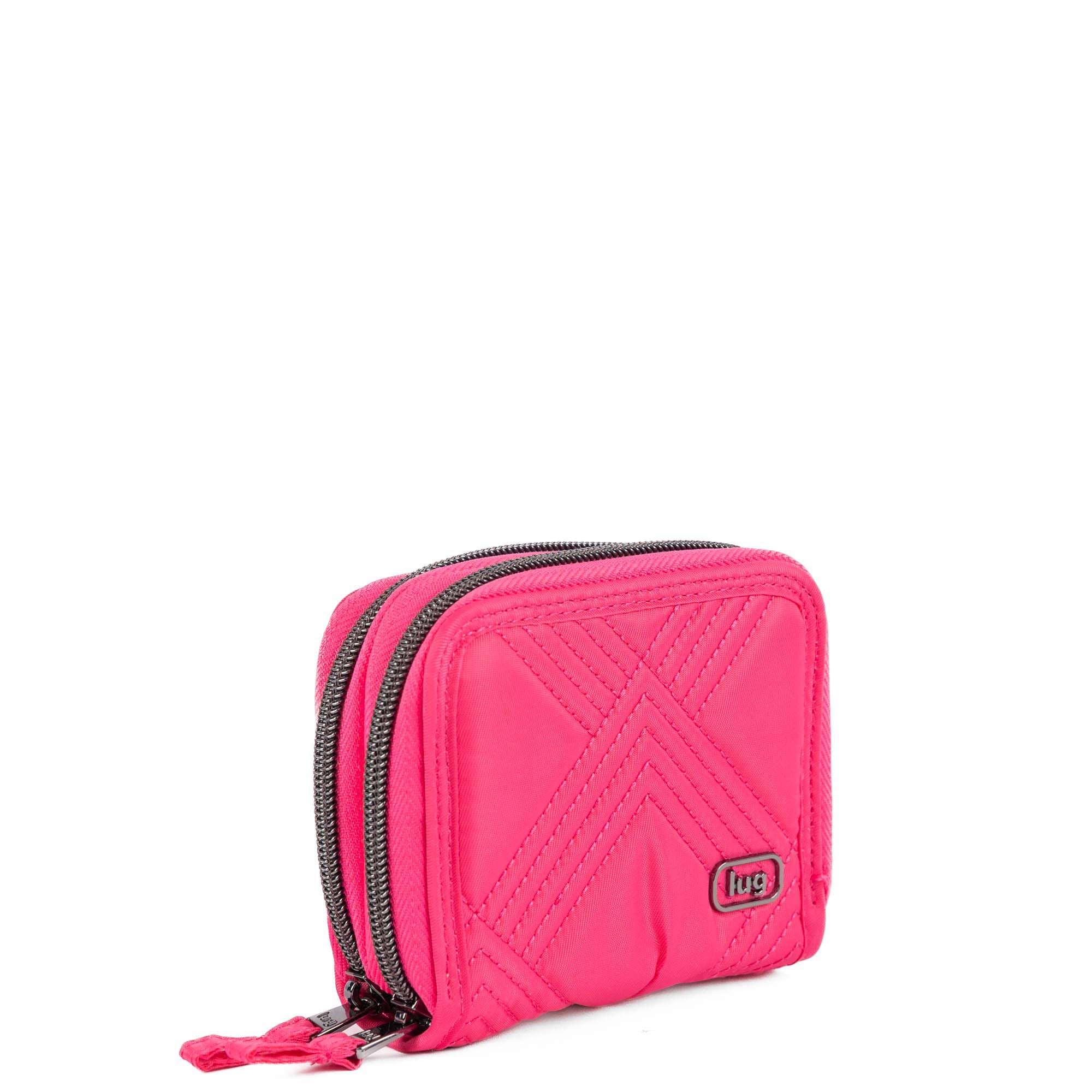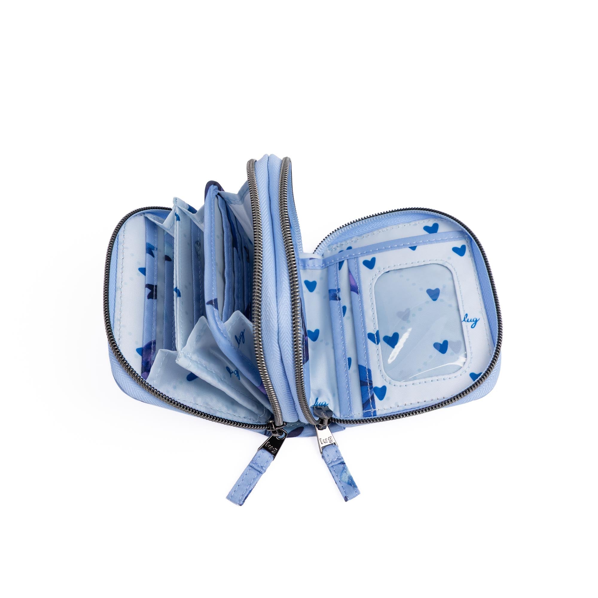 This mighty little wallet has a split personality with not one, but two main compartments. One side opens flat and stores bills, frequently used cards, and has a handy ID window. The other opens like an accordion, making the rest of your cards exceptionally easy to access. And for coins, a zip pouch on the back.